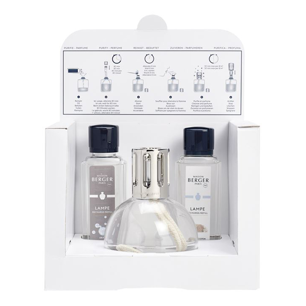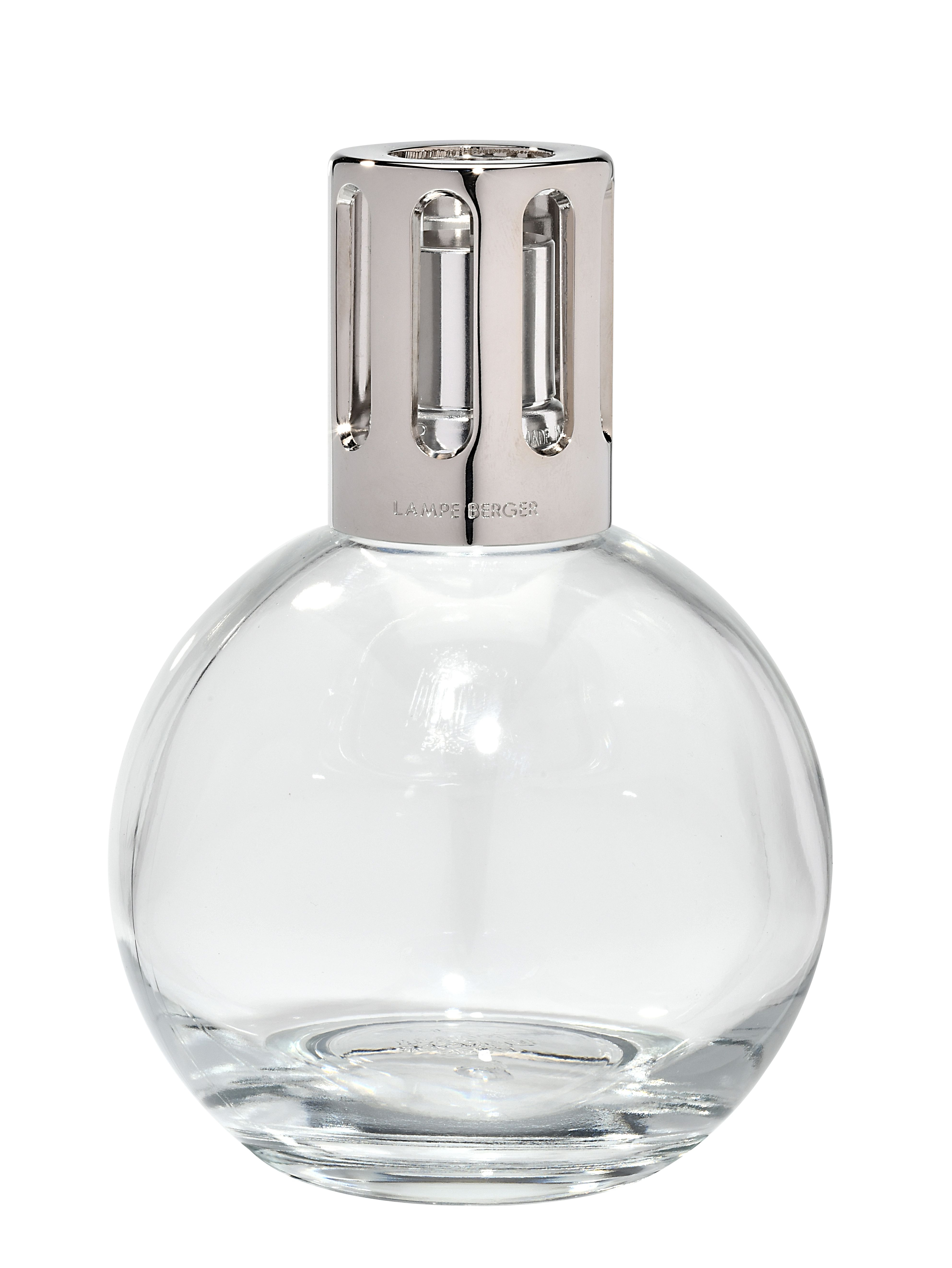Lampada in vetro trasparente corredata da due flaconi di parfum de maison: Neutre e Caresse de Coton.