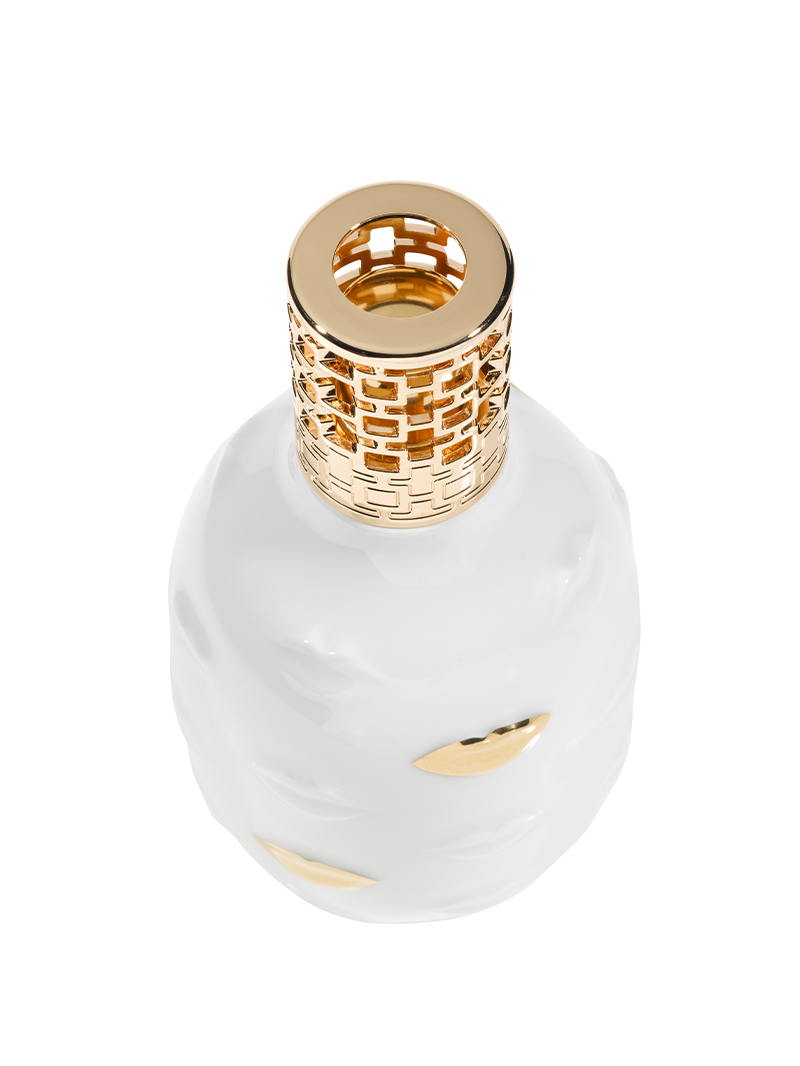 Lampada in vetro trasparente corredata da due flaconi di parfum de maison: Neutre e Caresse de Coton.