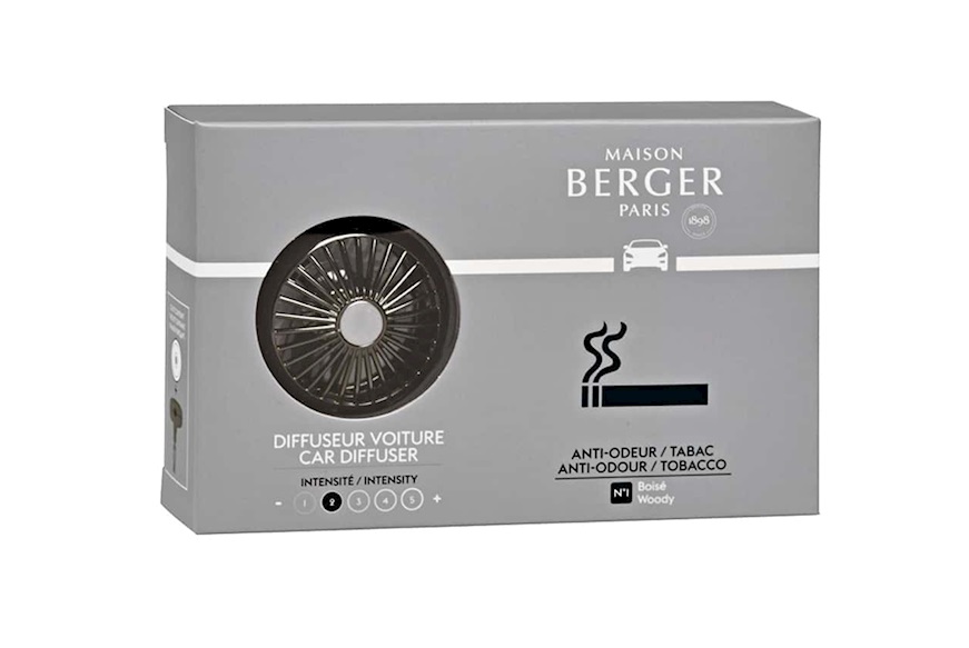 Confezione di Maison Berger Paris contenente un diffusore per auto e una ricarica alla fragranza anti odori tabacco.